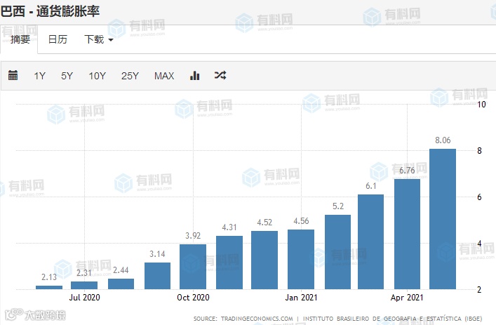2021年5月,巴西的CPI年率激增8.06%,创近五年来最大涨幅。