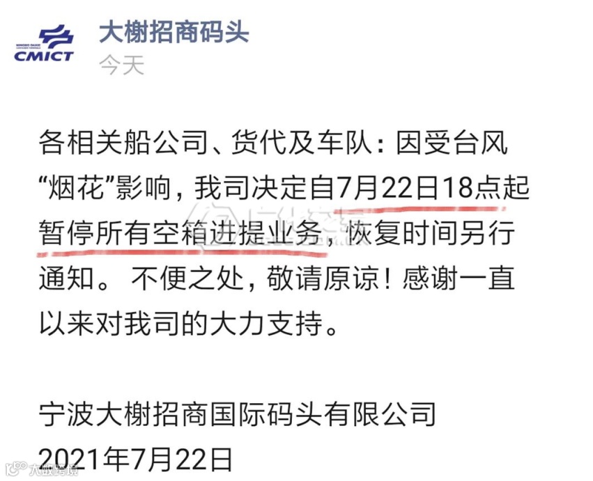 宁波大榭招商国际码头22日给各相关船公司、货代及车队发布通知,因受台风“烟花”影响,大榭招商码头决定自7月22日18点起暂停所有空箱进提业务,恢复时间另行通知。