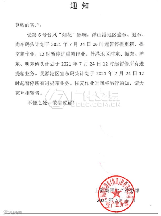 吴淞港区宜东码头计划于2021年7月24日12时起暂停所有进提箱业务。恢复作业时间将另行通知。
