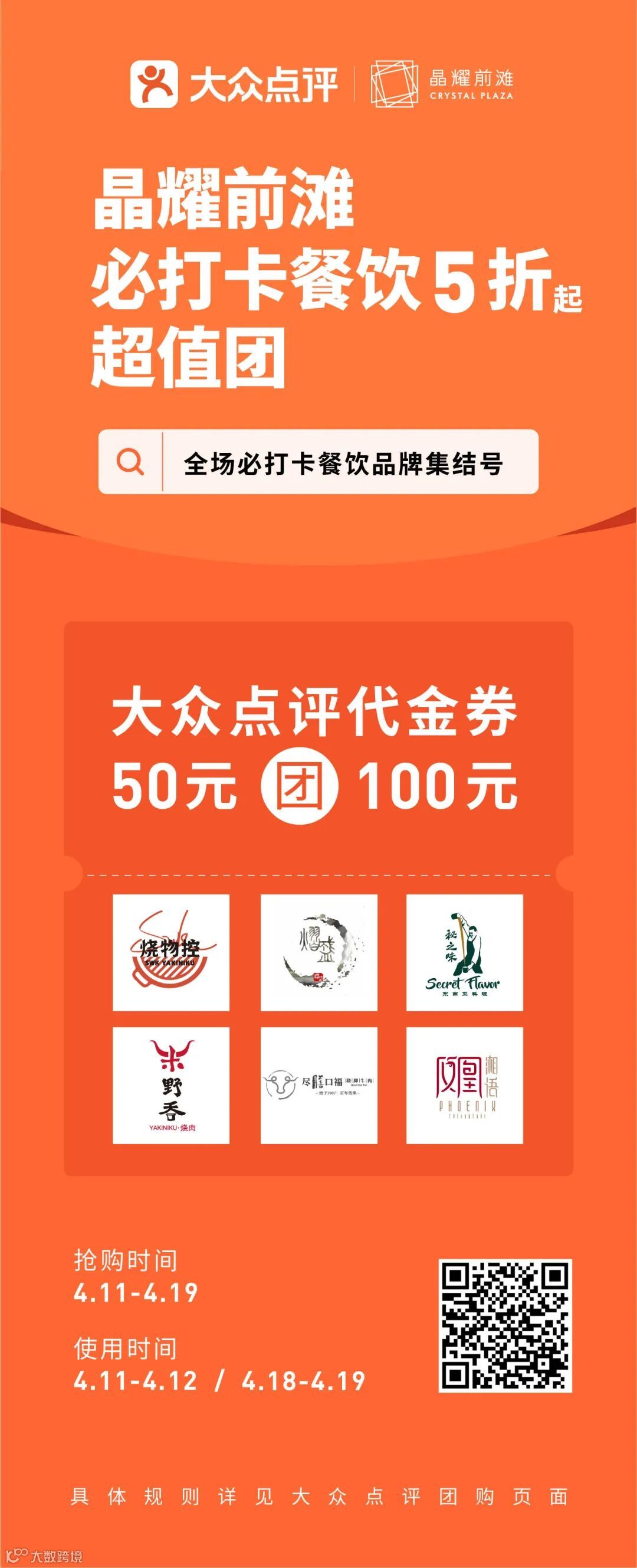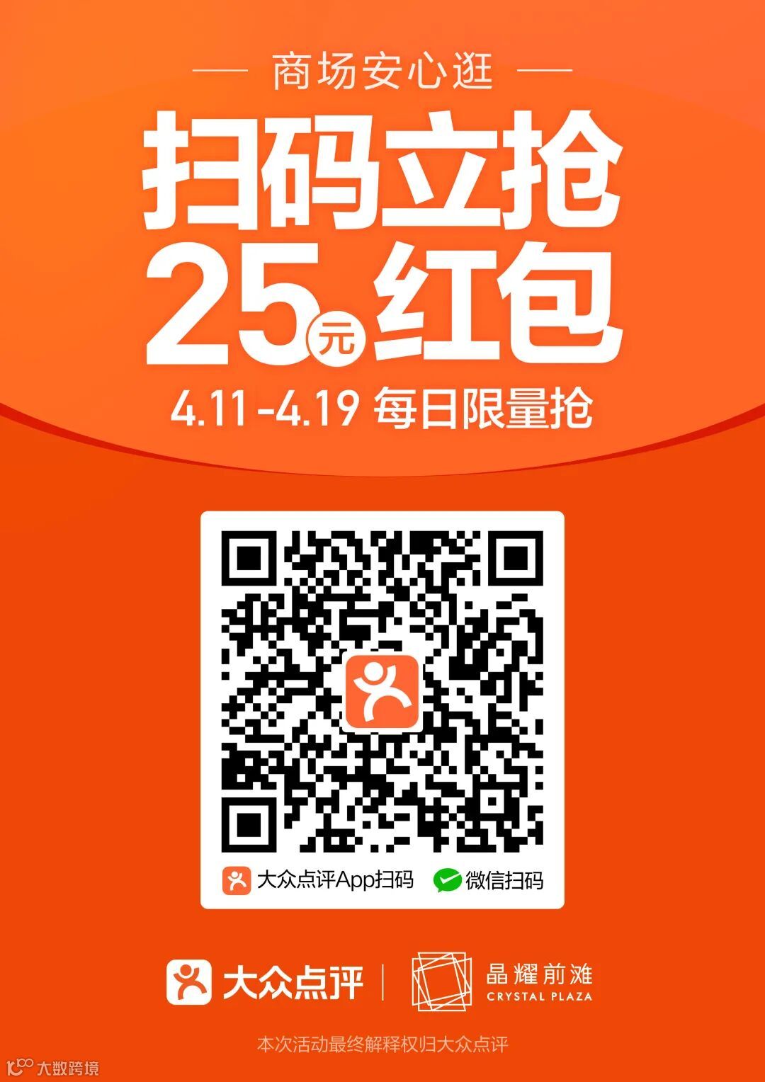 *每位消费者最多可以领取30减15、50减25抵用券各一张,该叠加红包仅限抵扣4.11-4.19期间的商场团购券