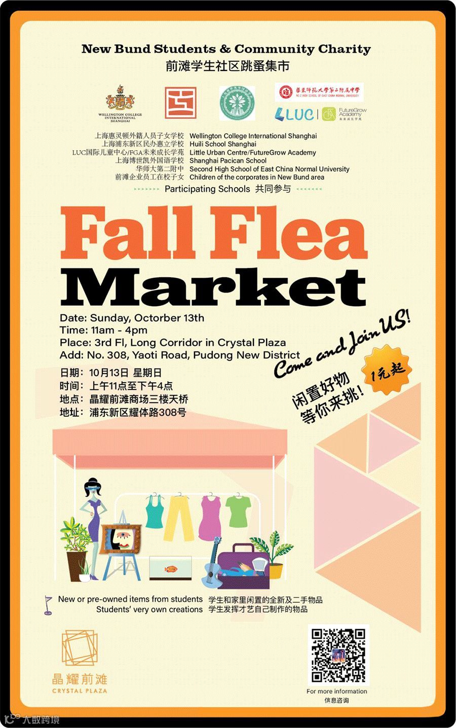 Shanghai Community Flea Market, which will be run by student volunteers is coming to Crystal Plaza! You can buy/sell pre-owned goods here. You can set your own price to sell or trade freely as well as making friends and learning how to do business. Don’t miss the opportunity!