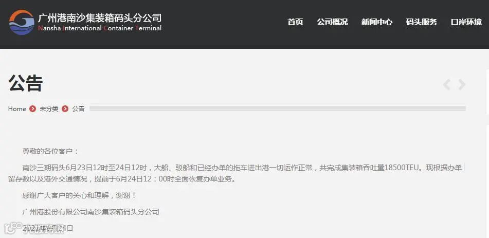 6月24日下午,广州港股份南沙集装箱码头分公司(南沙三期码头)在官网发布公告称,根据办单留存数以及港外交通情况,南沙三期码头已于6月24日12时,全面恢复办单业务。