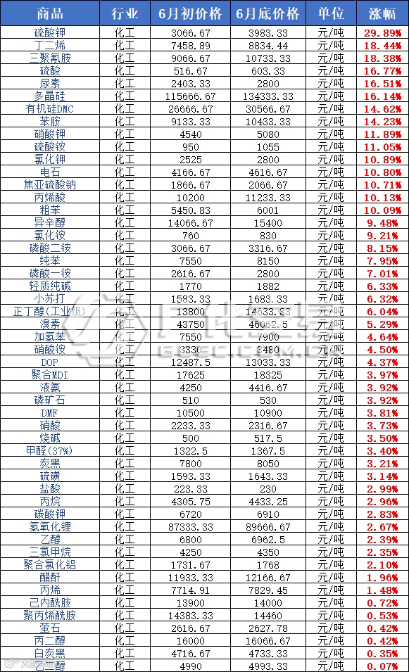 根据大宗商品走势显示,6月上涨的大宗品共有51种,前三位为:硫酸钾(29.89%),丁二烯(18.44%)、三聚氰胺(18.38%)。