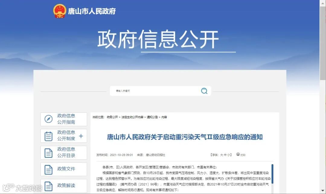 根据国家和省气象部门预测,自10月28日起,我市受弱气压场控制,风力小、湿度大,扩散条件差,将出现中至重度污染过程,达到橙色预警水平。为有效应对此轮污染过程,最大限度减轻污染程度,按照省大气办《关于加强管控积极应对本轮污染过程的提醒函》(冀气领办函〔2021〕96号),市重污染天气应对指挥部决定,自2021年10月27日20时全市启动重污染天气Ⅱ级应急响应,解除时间另行通知。现将有关事项通知如下:(正文略)