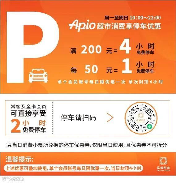 进入晶耀前滩CrystalPlaza公众号,点击下方会员中心-自助积分,选择Apio超市,即可拍照积分获取免费停车券!