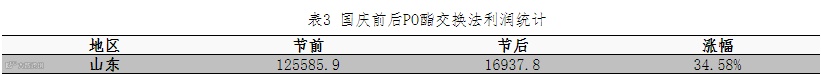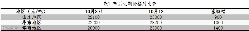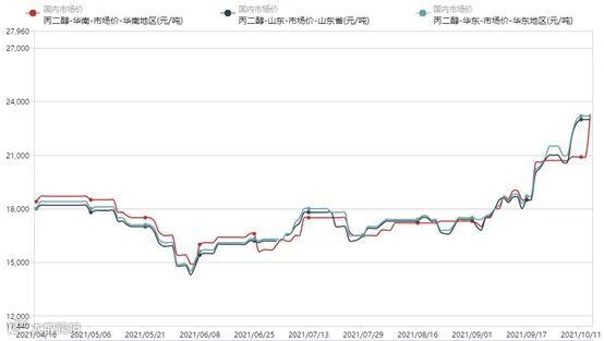 国庆节前,因场内无丙二醇现货,价格不断上涨,同时部分企业产量预售情况偏好,生产厂家限制贸易商拿货量,故节后丙二醇价格再次上推运行。加之原料环氧丙烷的上调再次给丙二醇的上涨提供支撑。