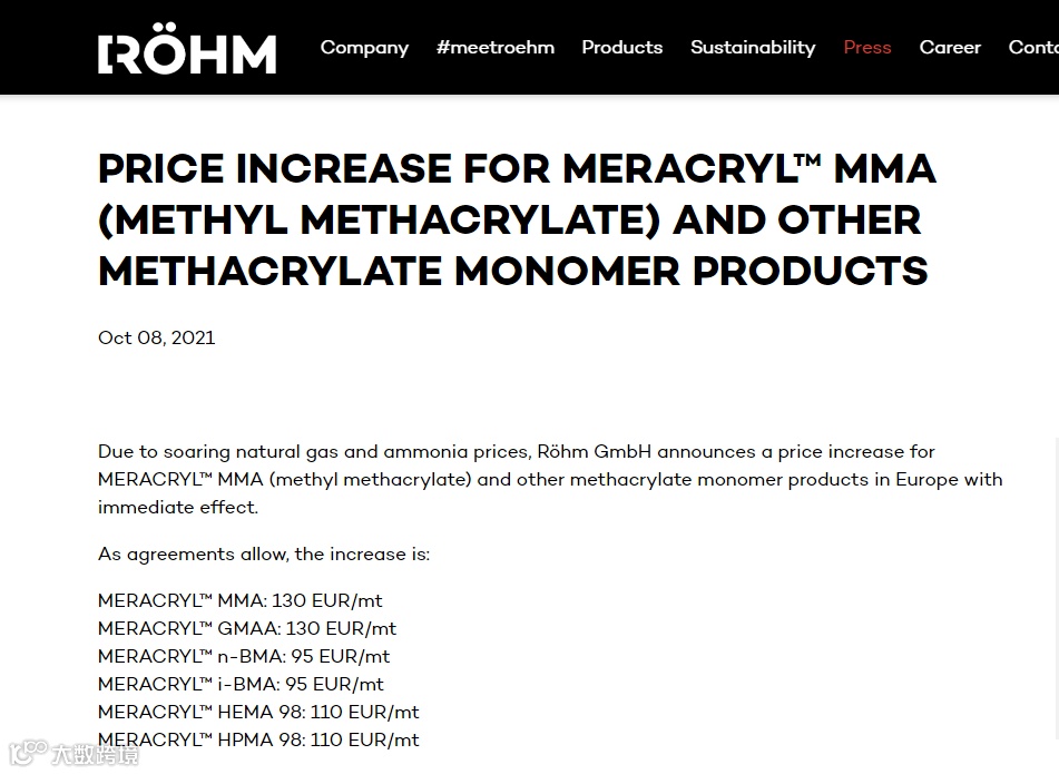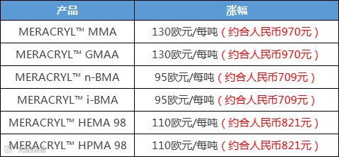 与此同时,10月8日罗姆化学官方宣布,由于天然气和氨价格飙升,公司将立即提高欧洲的 MERACRYL™ MMA(甲基丙烯酸甲酯)和其他甲基丙烯酸酯单体产品的价格。