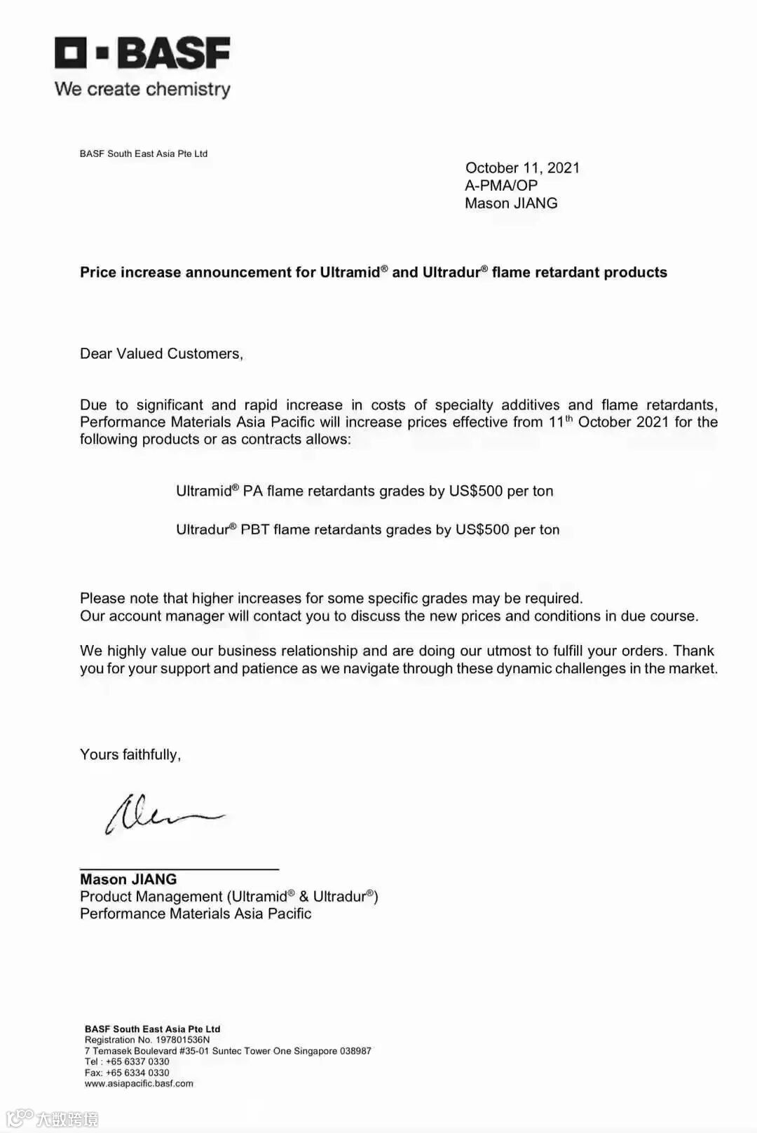 10月11日,巴斯夫发布涨价函,由于功能助剂和阻燃剂的价格明显快速增加,自2021年10月11日起,亚太地区Ultramid®PA和Ultradur® PBT阻燃级产品价格上调: