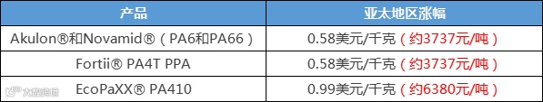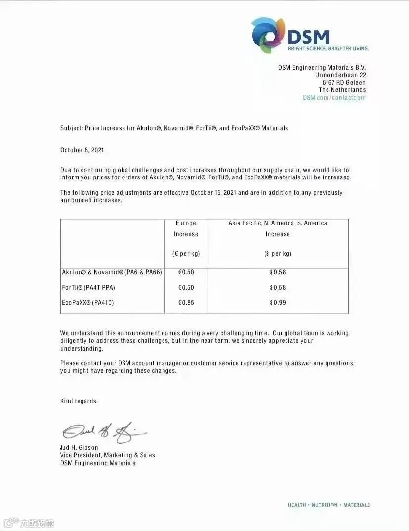 同时宣布自2021年10月15日起,上调亚太地区以及欧美地区的Akulon®&Novamid®(PA6&PA66)、ForTii®PA4T PPA,EcoPaXX®(PA410)的价格:
