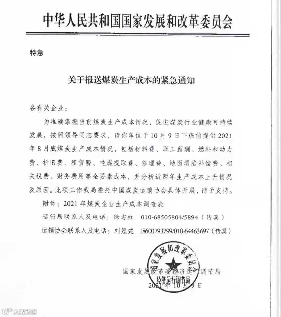 此外,昨日市场传出国家发改委一份特急文件,文件显示国家发改委已经开始统计煤炭生产成本。