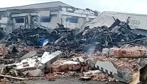 视频显示,火灾现场有大量黑色浓烟,有明火仍在燃烧,现场有消防员正在灭火。