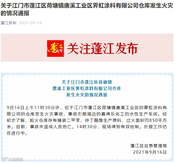 市蓬江区应急管理局发布通报:9月16日上午11时30分许,位于江门市蓬江区荷塘镇唐溪工业区的霁虹涂料有限公司的仓库发生火灾事故,