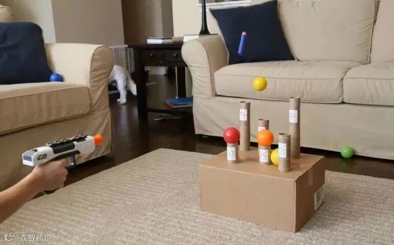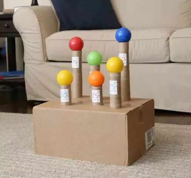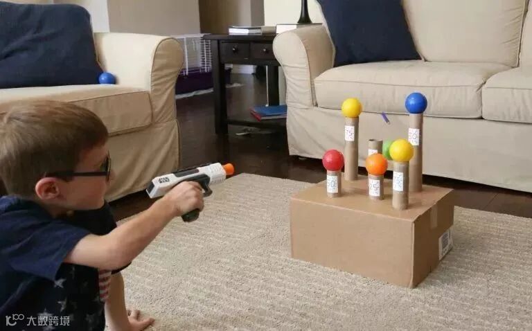 最后在每个纸筒上放置一个海洋球,就可以开始射击啦