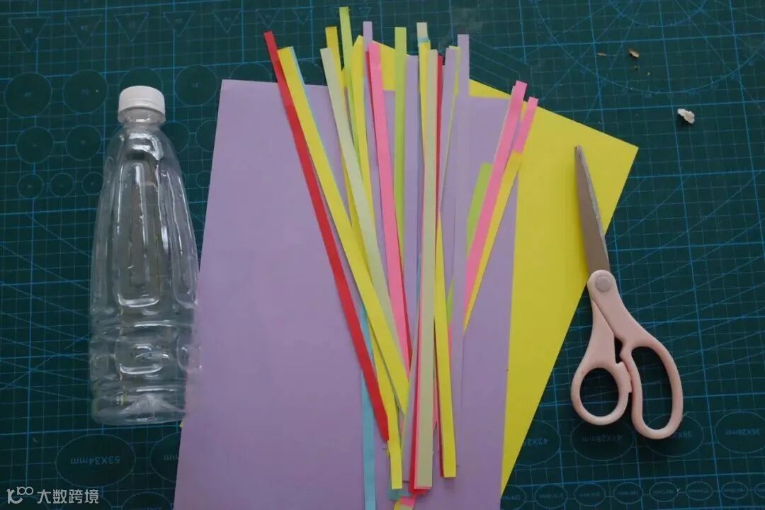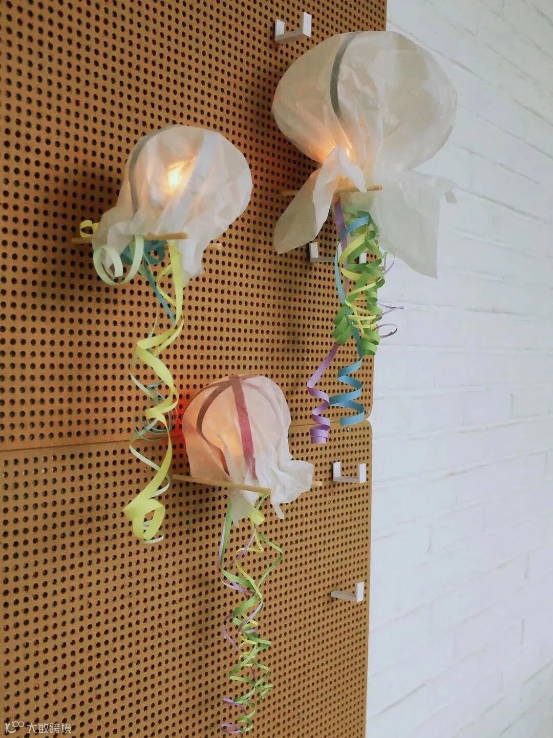 将普通彩纸剪成条状,卷曲后,粘贴在灯下方作为水母触角