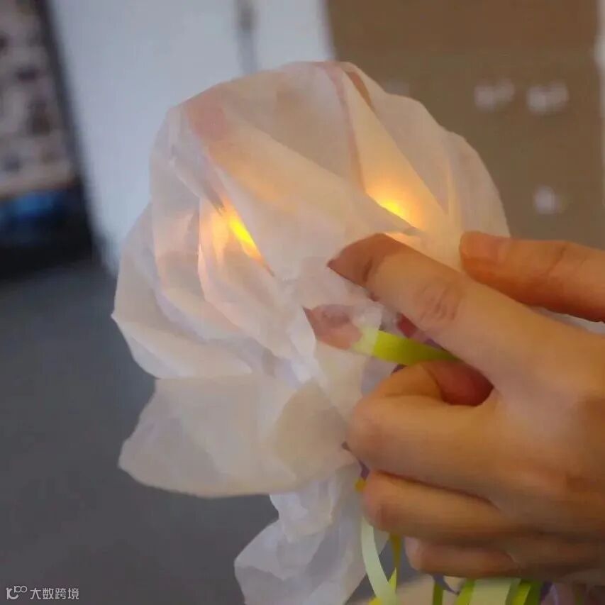 最后将链接了LED灯的纽扣电池放入水母灯罩中
