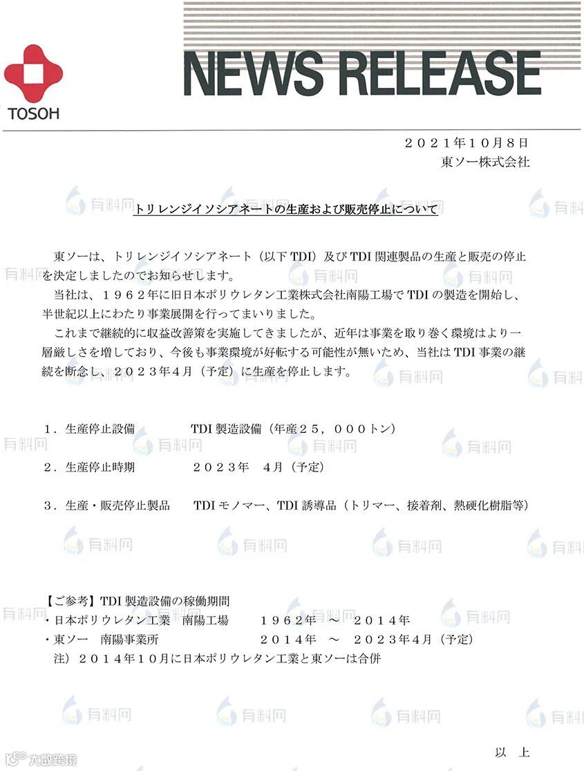 近日,日本主要TDI供应商日本东曹TOSOH(原NPU)宣布,将于2023年4月停止TDI及TDI相关产品的生产和销售。