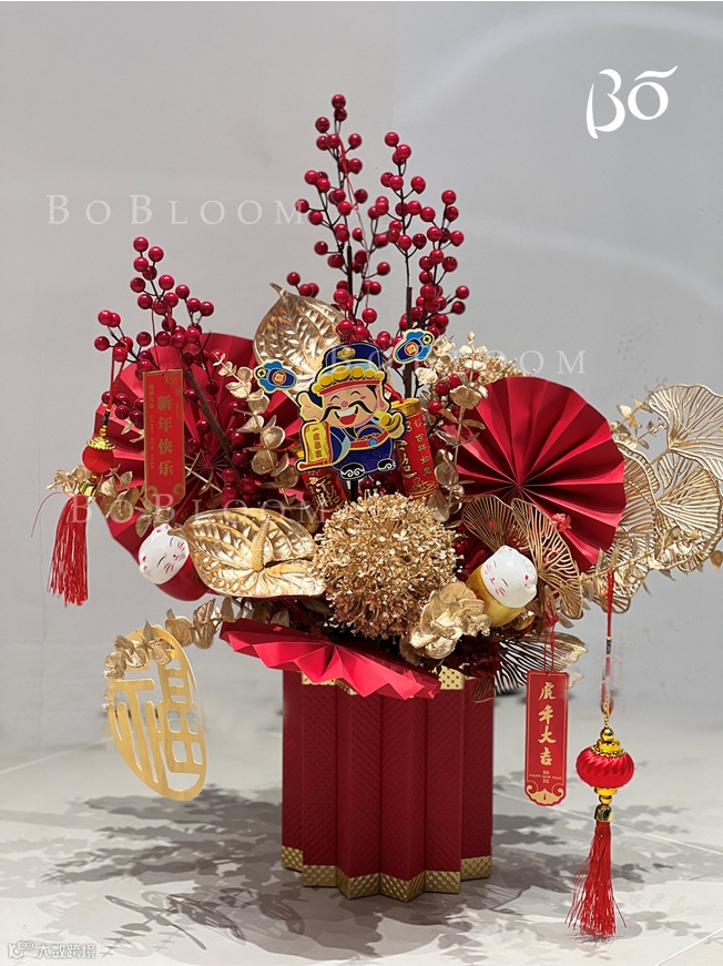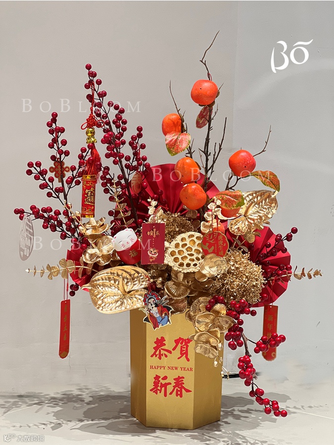 「BOBOLOOM花店」将新春主题融入插花艺术,设计出多款年宵花礼,红金配色热闹而不失高级。大「桔」大利,「柿柿」如意多种主题插花,更以花的美好寓意,翘首期许崭新的一年。