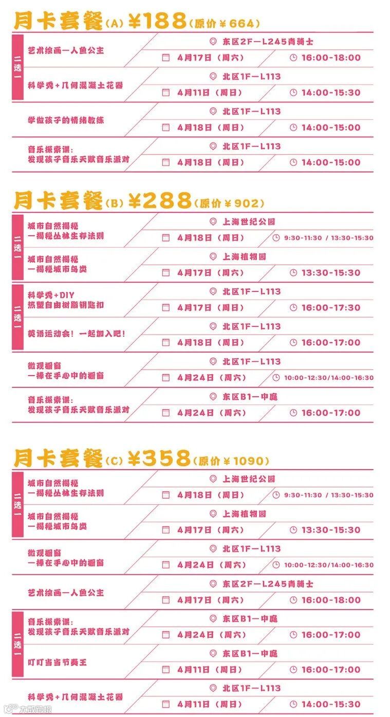 三种月卡套餐特别定制不同活动课程,多种组合搭配,给予家长更多选择。在活动中汲取更多知识的同时,还能让小朋友交到志同道合的好伙伴!还有错时课程,一次报名,两次游玩,二孩家庭不容错过的最佳选择!