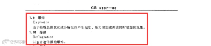 其次,“爆燃”和“爆炸”也是有着区别的。我们注意到在上一个标准GB5907-88中,“爆燃”确实归结于“爆炸”的一种。