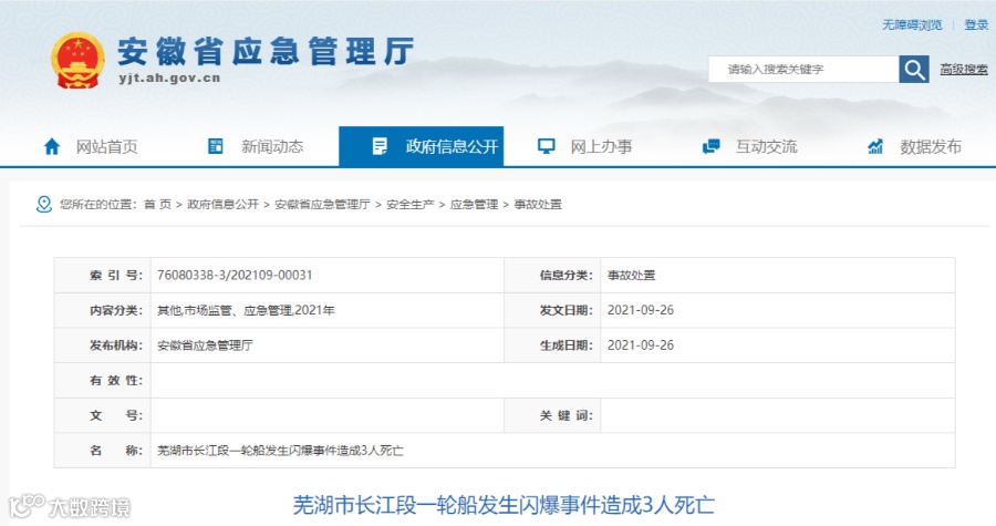 据安徽省应急管理厅消息:9月25日晚,浙江省华泓海运有限公司所属“华泓18”轮(散装化学品船,最低配员11人,实际在船船员11人)在芜湖市鸠江区长江段的东梁山危险品停泊区锚泊时,轮机长等3名船员下舱作业,22时40分左右发生闪爆,致3人受伤。