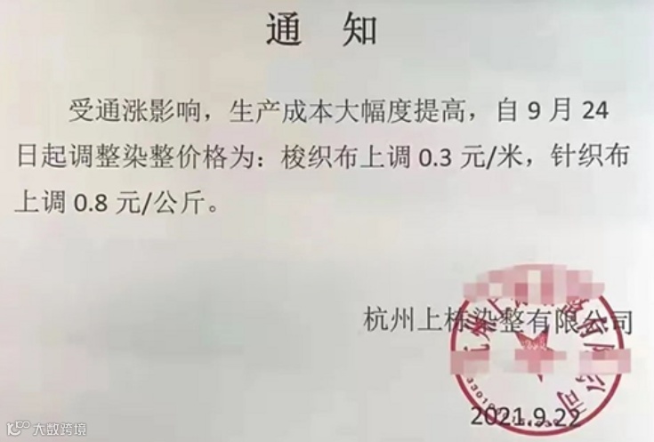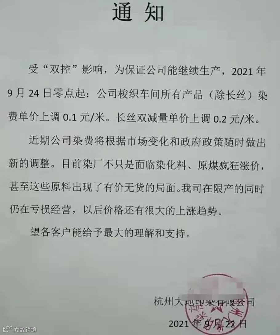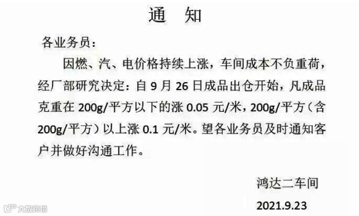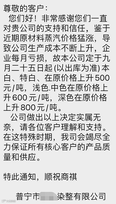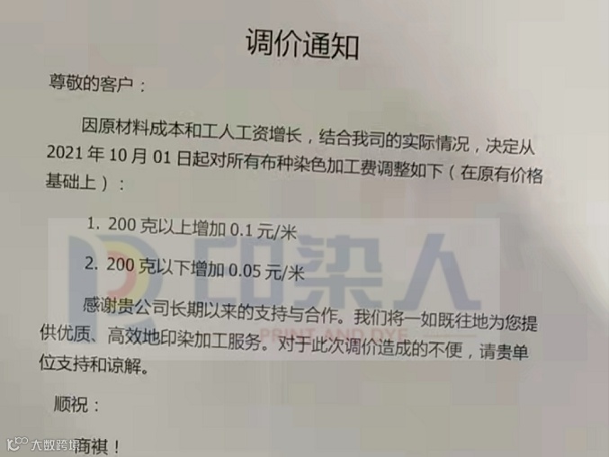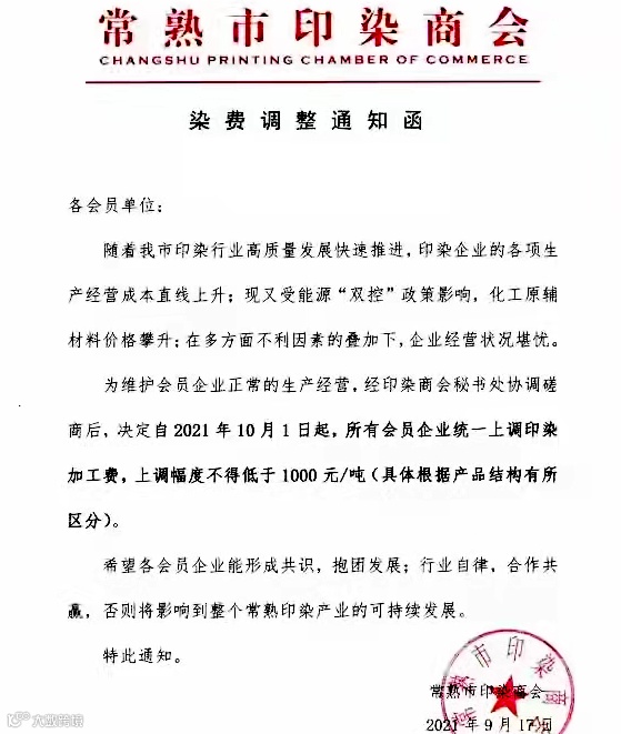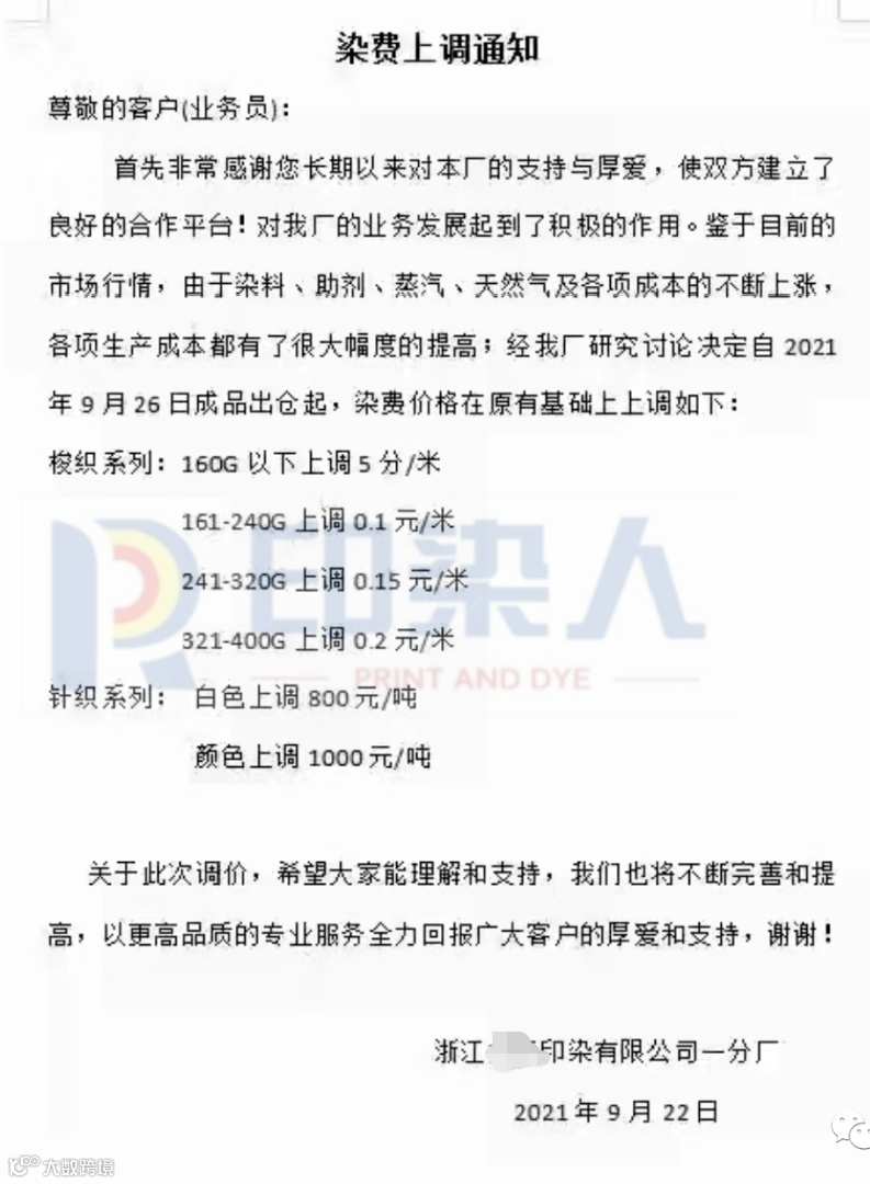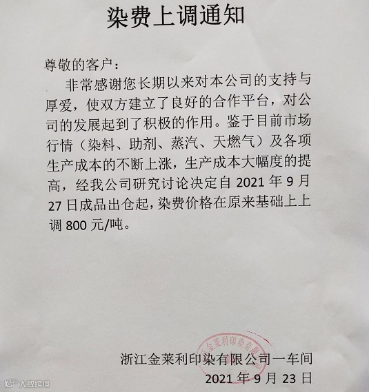 迫于无奈,印染厂或将进行染费价格调整来缓解各项生产成本压力。9月下旬,多家印染厂紧急调整染整加工费来应对不断上涨的成本,分别涉及到针织面料、梭织面料系列。