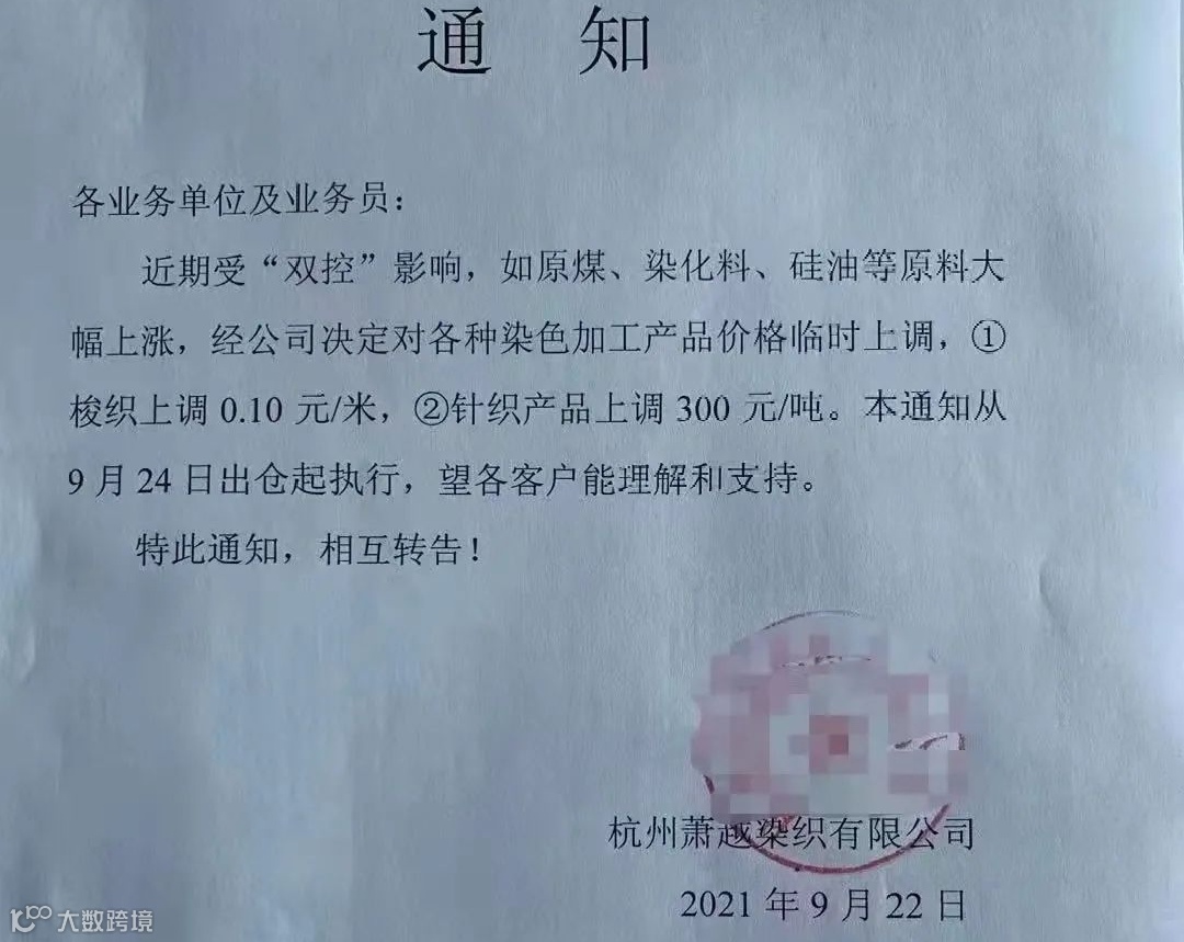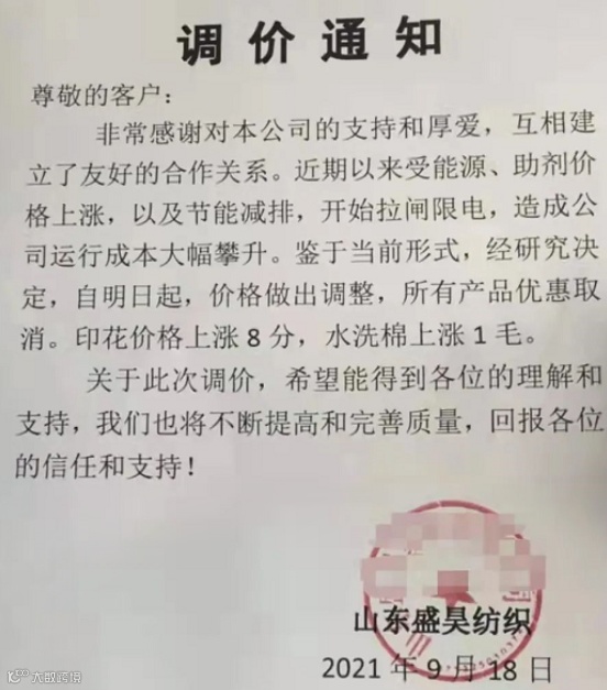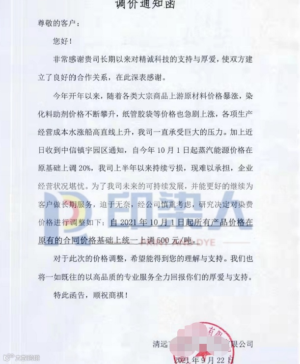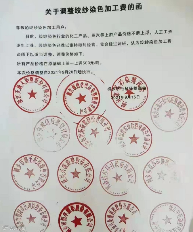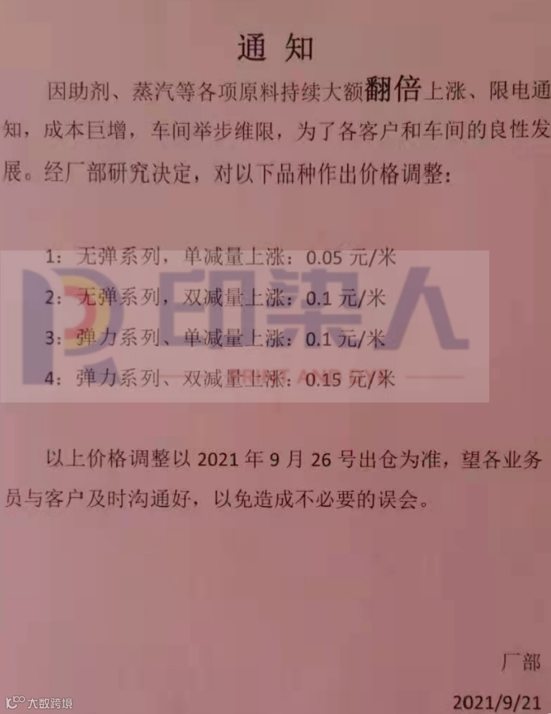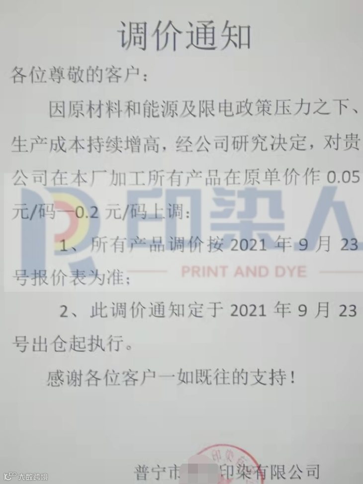 迫于无奈,印染厂或将进行染费价格调整来缓解各项生产成本压力。9月下旬,多家印染厂紧急调整染整加工费来应对不断上涨的成本,分别涉及到针织面料、梭织面料系列。