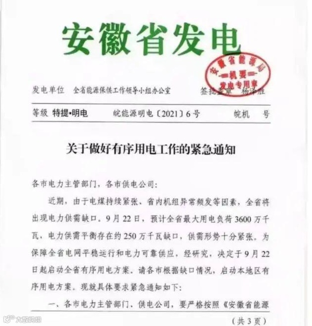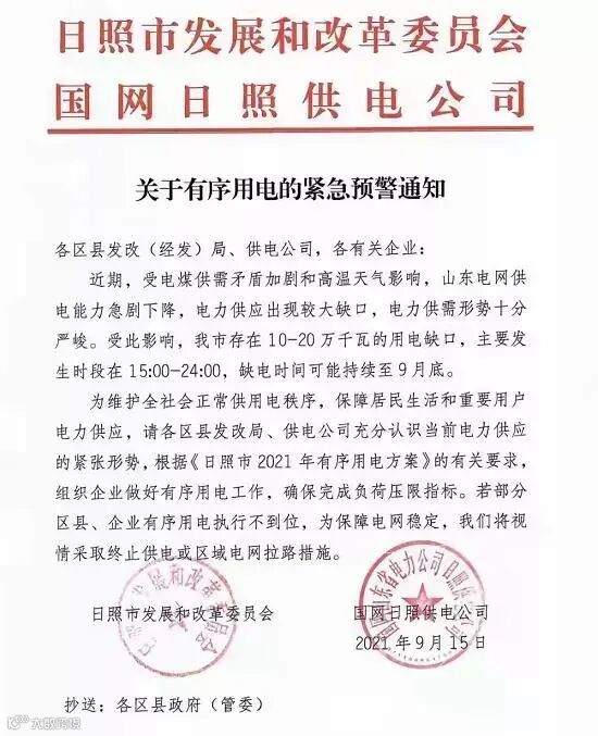 据日照供电公司预警公告显示,山东全省煤炭供应不足,日照每日存10-20万千瓦用电缺口,主要发生时段在15:00-24:00,缺点时间延续至9月,限电措施启动。