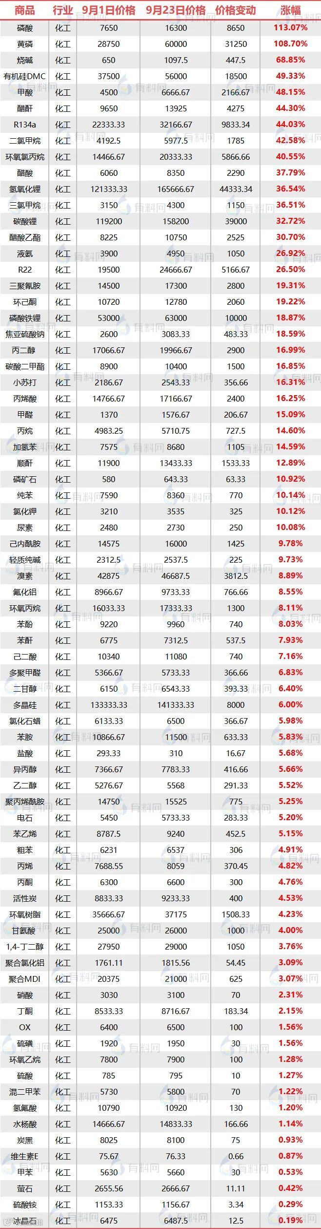 9月份化工市场整体以上涨为主,叠加限电、环保、控能耗等政策推进,预计化工市场的整体涨势会延续到年底。目前魔涨的原料越来越多,有机硅、黄磷等产品冲击10万,部分原本几百元的化工品也开始突破5千大关。例如:片碱报价月内上涨近80%,报价突破5000元,部分厂家已封盘。