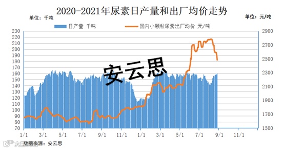 首先从供应端来说,8月25日起,尿素新一轮检修开始,8月26日至9月上旬检修较为集中。后期也将进入秋冬季节,环保限产和天然气限气还将叠加,预计日产量或将较难回到16万吨以上。预计后期尿素产量的消极影响将减弱。