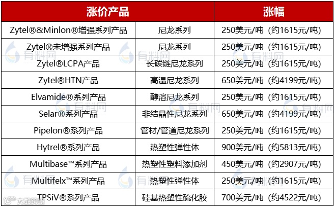 9月1日,杜邦发布涨价函,由于市场因素影响,宣布10月1日起上调亚太地区部分产品价格,涉及产品包括长碳链尼龙、特种高温尼龙、醇溶尼龙、热塑性弹性体等多款产品,涨幅最高达5800元/吨。