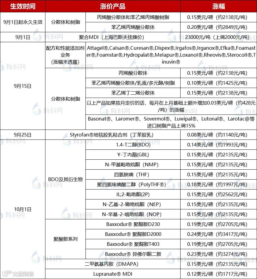 此外据不完全统计,自8月25日起,巴斯夫连发7封涨价通知,宣布上调MDI、BDO及其衍生品、分散体和树脂、丁苯乳胶、聚醚胺系列等产品的售价,涨幅最高为3400元/吨。