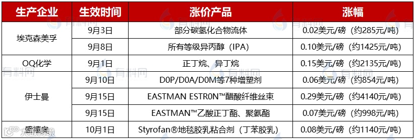 除去上述公司外,埃克森美孚、OQ化学、伊士曼、盛禧奥等化塑大厂集体涨价!涨幅如下: