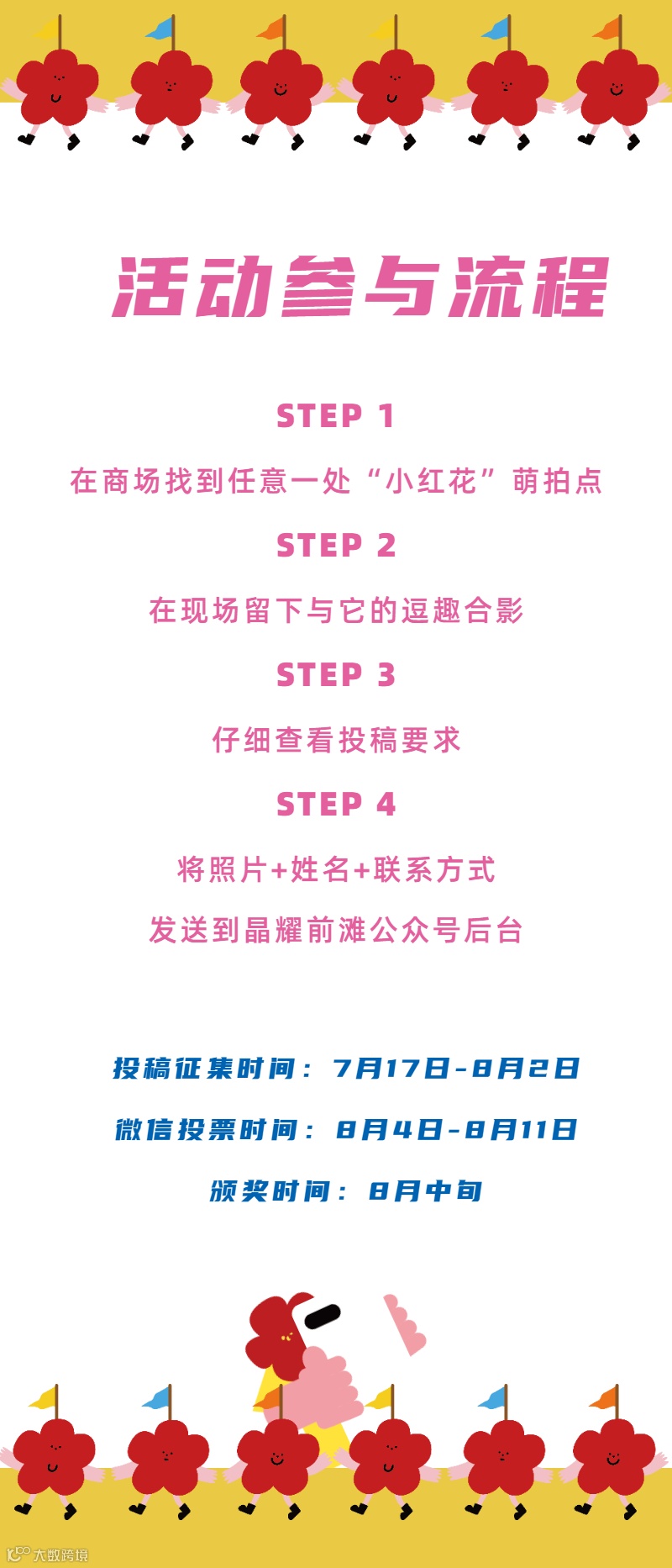 1) 在晶耀前滩 “小红花”萌拍点,拍摄1张原创合影(最多可3图拼接)