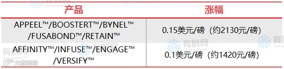 8月2日,陶氏宣布将与9月1日起上调部分特种树脂产品的价格,涨幅最高达0.15美元/磅(约2130元/吨)。