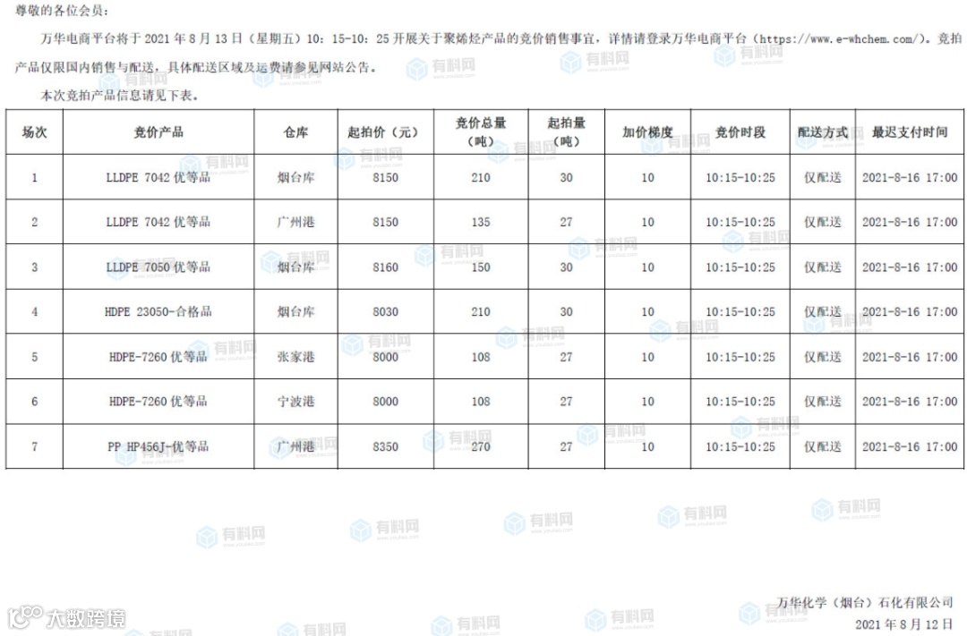 万华电商平台发布聚烯烃产品竞拍交易公告。