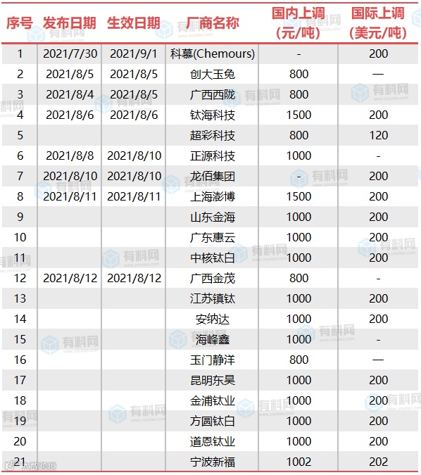 据不完全统计,截止至8月12日,国内外有21家钛白粉生产商宣涨,幅度在800-1500元/吨,国内淡季市场开启逆势涨价潮,为“金九银十”预热市场。