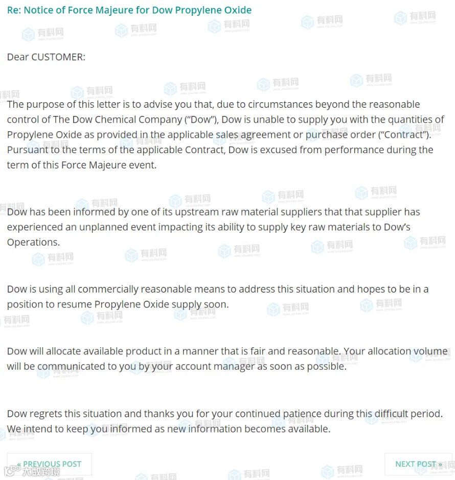 陶氏美国德克萨斯州的34万吨/年MDI装置因原材料供应商出现意外机械故障,供应被迫中断,MDI不可抗力自2月份延续至今。
