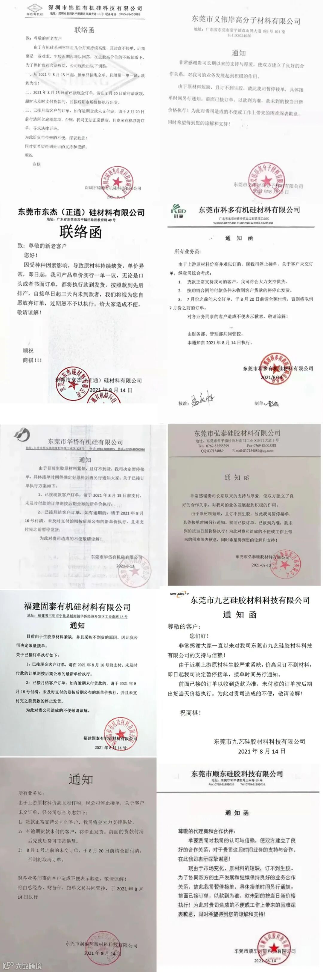 此轮涨价大多数企业涨幅都在5%-10%之间,且有近半数企业表示接下来接单只接受现金单,且一单一议等定价政策。对于业内人士来说,都知道下游早已溃不成军,但对看跌预期较少,极有可能今年有望突破2018年历史高位。 接下来是一大波硅酮胶、液体胶、硅胶助剂企业的涨价通知函!