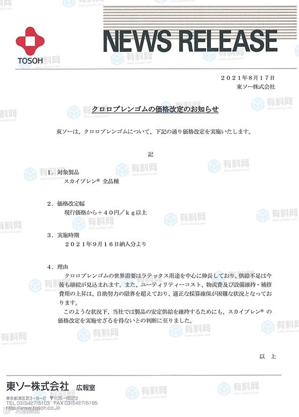 8月17日,东曹株式会社再发涨价通知,宣布将于9月16日氯丁橡胶的价格在现有价格基础上上调40日元/千克(约2371元/吨)以上。