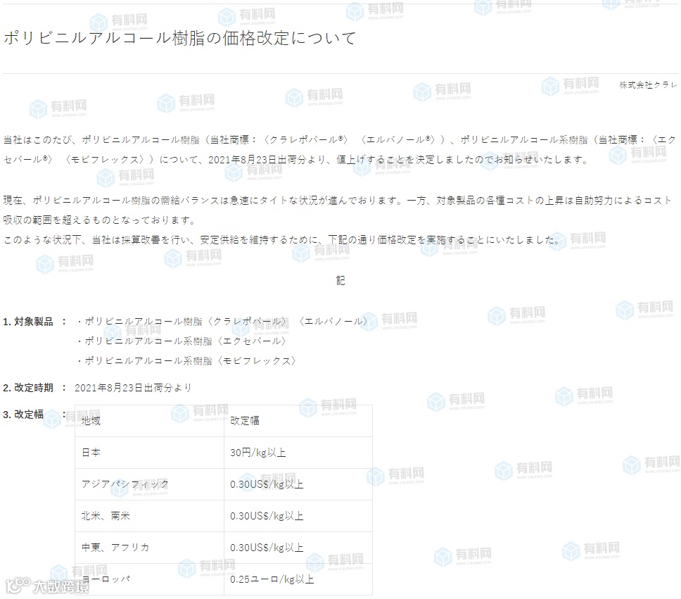 8月18日,聚乙烯醇(PVA)主要供应商可乐丽宣布将于将于8月23日起上调公司聚乙烯醇树脂的售价,其中亚太地区上调0.30美元/千克(约1943元/吨)。