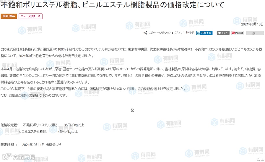 8月18日,DIC全资子公司DIC材料株式会社称将于9月1日起上调所有不饱和聚酯树脂和乙烯基酯树脂的价格,其中不饱和树脂上调35日元/千克(约2067元/吨),乙烯基树脂上调40日元/千克(约2362元/吨)。
