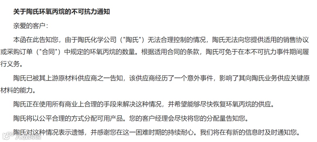 另外,陶氏也宣布环氧丙烷生产遭遇不可抗力。主要由于其上游原材料供应商经历了一个意外事件,影响了其向陶氏业务供应关键原材料的能力。