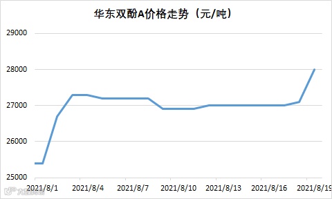 本周,浙石化副牌双酚A竞拍价格从26000开始,7轮后溢价1150元/吨。受该利好支撑,市场挺涨心态高涨,8月19日国内双酚A价格大涨至28000元/吨附近,单日拉涨800元/吨!