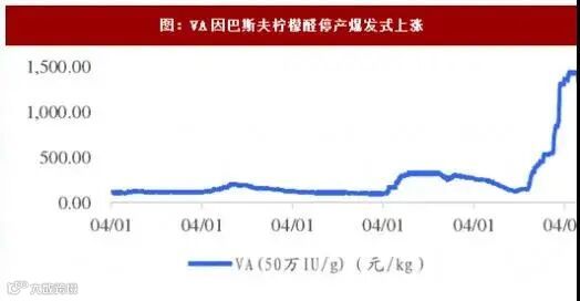 据了解,VA、VE、VB5技术门槛较高。多数品种仅4-6家生产厂,寡头垄断定价能力强。2017年10月巴斯夫柠檬醛装置发生火灾,致使下游VA、VE等产品原料短缺,导致此后VA爆发式涨价。