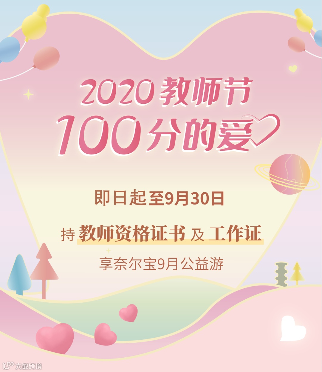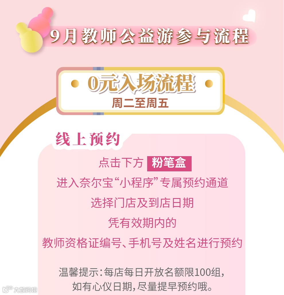 今年9月,将爱延续,奈尔宝诚挚邀请在职老师与您的孩子来参加“100分的爱”教师免费游玩活动。我们将提供了一个满溢欢乐和温馨的空间,让您和您的孩子拥有更美好的回忆。