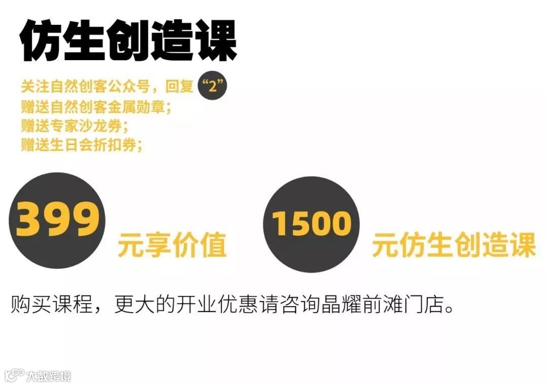 仿生创造课:会要求学生按照仿生创新过程,在定义难题任务后,研究各种自然生境中的生命所隐藏的科学规律,并学习如何将这些生命规律模拟应用到人工设备上,用来解决特定问题,比如困扰人类的资源、疾病、灾害、能源、生态、气候等等重大挑战。培养学生的是从“发现”到“发明”的创造能力。在课程中,学会使用初级数字设计和制造,帮助学生掌握关于“规律、因果、系统”等“七大科学思维”,并训练“科研科创实践”中“提问、调查、发现、建模、设计、制造、测试、迭代、汇报”的综合实践能力。该课程按照每周一次的课程方式授课。