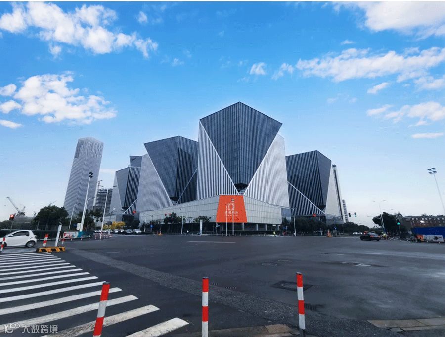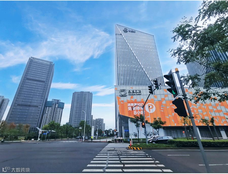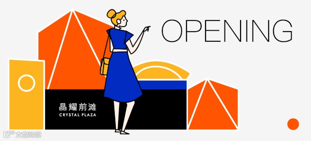 前方出现晶耀前滩建筑体(如图所示),穿越十字交叉路口,即抵达晶耀前滩购物中心。