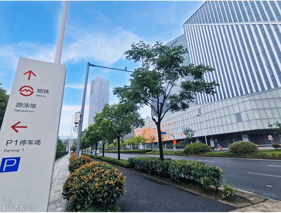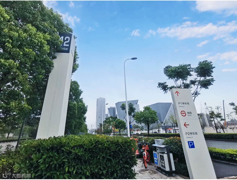 当前方出现晶耀前滩建筑体(如图所示),穿越人行横道,即抵达晶耀前滩购物中心。