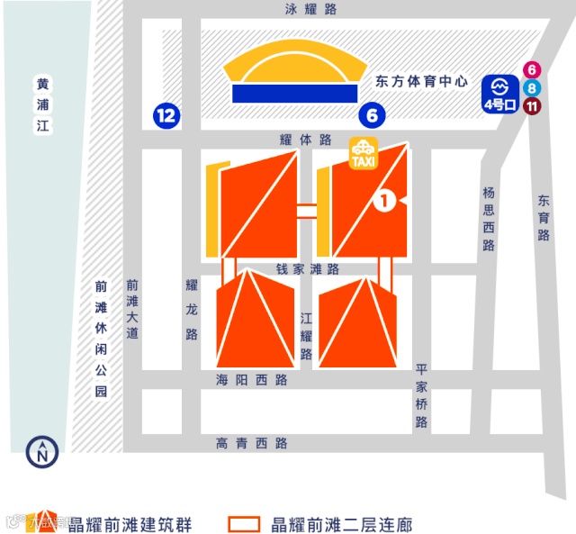 出东方体育中心P2停车场12号口,左转并沿耀体路直行约100米。