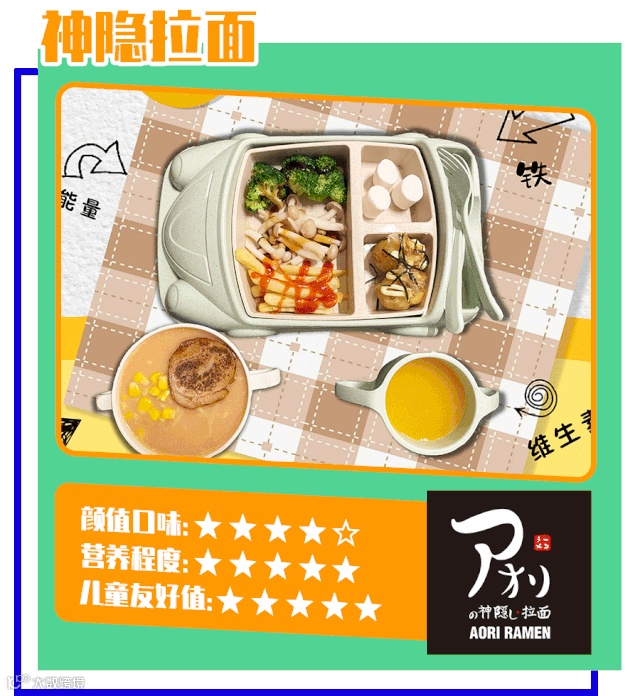 这里提供颜值高且营养均衡的儿童套餐,清爽绿色的食材组合很是让人赏心悦目。日式拉面的浇头、面的软硬、汤的浓度皆可自行选择,对口味偏好各异的小朋友们来说很是友好。听说运气好的话还会被赠送游戏币哦。